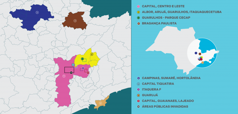 Localidades em estudo: área central de São Paulo; Tiquatira; Itaquera; Guaianazes e Lajeado; áreas invadidas da CDHU; Fazenda Albor; Guarujá; Guarulhos (Parque Cecap); Bragança Paulista; e Campinas, Sumaré e Hortolândia.